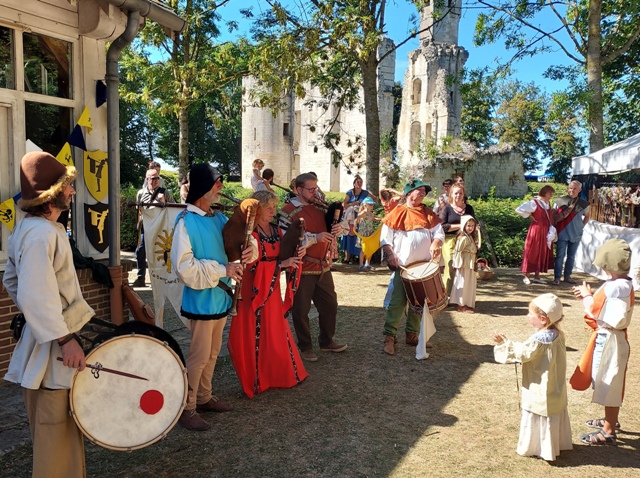 Bannière claquant au vent, vêtus de leurs plus jolis atours, une petite troupe de trouvères marie avec bonheur les sons des cornemuses, des hautbois, et des tambours.